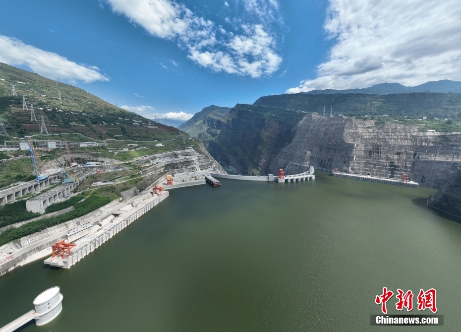 白鶴灘水電站由中國三峽集團投資開發建設,總裝機1600萬千瓦,共安裝16臺我國自主研制的全球單機容量最大功率百萬千瓦水輪發電機組。圖為航拍白鶴灘水電站。