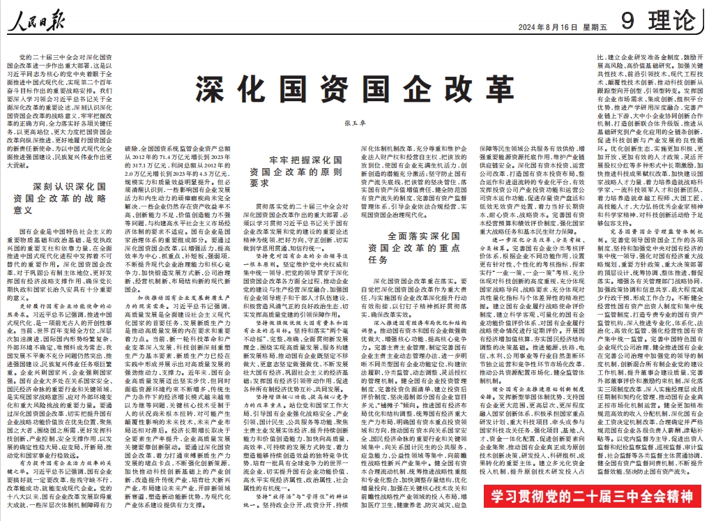 黨的二十屆三中全會(huì)對(duì)深化國資國企改革進(jìn)一步作出重大部署,這是以習(xí)近平同志為核心的黨中央著眼于全面推進(jìn)中國式現(xiàn)代化、實(shí)現(xiàn)第二個(gè)百年奮斗目標(biāo)作出的重要戰(zhàn)略安排。我們要深入學(xué)習(xí)領(lǐng)會(huì)習(xí)近平總書記關(guān)于全面深化改革的重要論述,深刻認(rèn)識(shí)深化國資國企改革的戰(zhàn)略意義,牢牢把握改革的正確方向,全力落實(shí)好各項(xiàng)關(guān)鍵任務(wù),以更高站位、更大力度把國資國企改革向縱深推進(jìn),更好地履行國資國企的新責(zé)任新使命,為以中國式現(xiàn)代化全面推進(jìn)強(qiáng)國建設(shè)、民族復(fù)興偉業(yè)作出更大貢獻(xiàn)。