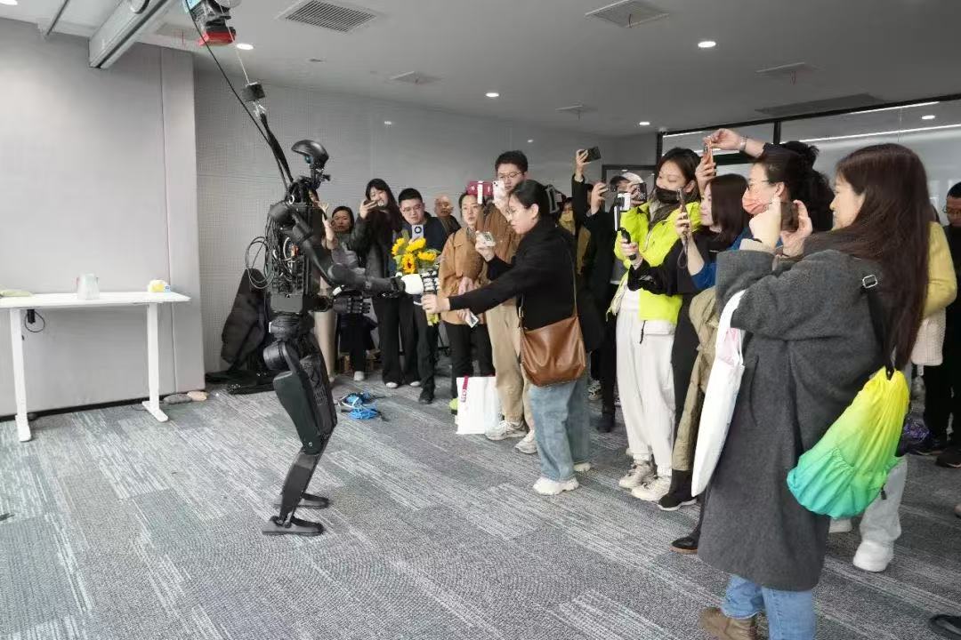 在“走進新國企·科技創新主力軍”活動現場,一款人形機器人吸引了一眾記者的目光。TeleAI人形機器人無需視覺雷達等外部觀測信息,輕松征服復雜地形。現場記者為TeleAI人形機器人送上鮮花,它也能穩穩接住。