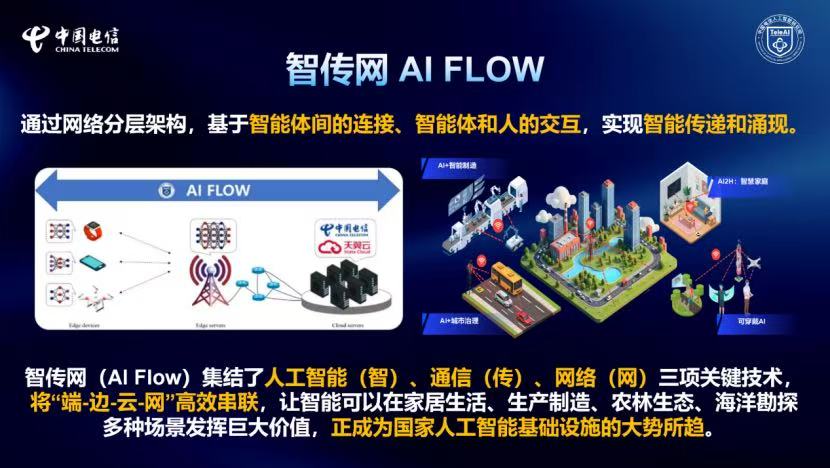 智傳網(AI Flow)突破了以數據驅動的智能涌現,實現基于連接和交互的智能涌現。它提供了一種新的服務模式,能夠發揮電信龐大主干網的優勢,可以解決數據傳輸延遲高、網絡帶寬占用大等問題。未來,三大空間將充滿智能的流動,一切都是高效的、有序的、便捷的。