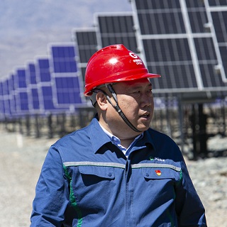寒冬酷暑,在這荒無人煙的“沙戈荒”,中國綠發新疆中綠電公司副總經理、安全總監郭凡東一次次巡檢著光伏板。這條路走了多少遍,他已數不清了。在他身后,矗立著一排排光伏矩陣,像一片藍色海洋,蔚為壯觀。