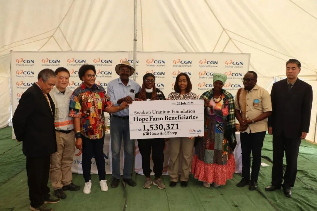 7月26日,中廣核鈾業發展有限公司下屬斯科公司設立的斯科基金會在納米比亞埃龍戈省達偉卜農場正式啟動“希望農場”項目。活動現場,斯科基金會向當地3個農村合作社30名低收入農民捐贈了首批630頭山羊和綿羊,年內將完成另外370頭羊捐贈。