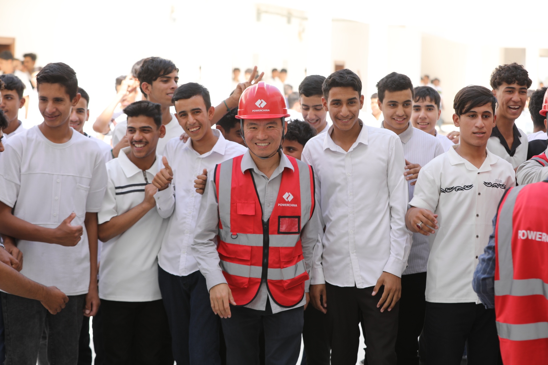 在新建成的穆薩納省胡達爾高級中學,當地學生與中國電建項目工作人員合影