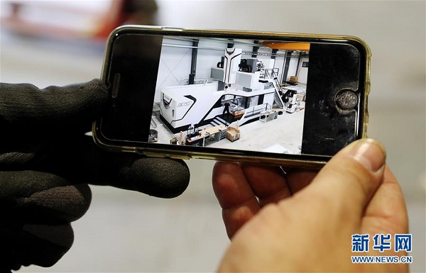 德國工程師馬丁·霍爾茨海德在安裝現場用手機展示“金牛座”龍門銑床安裝完成后的效果圖